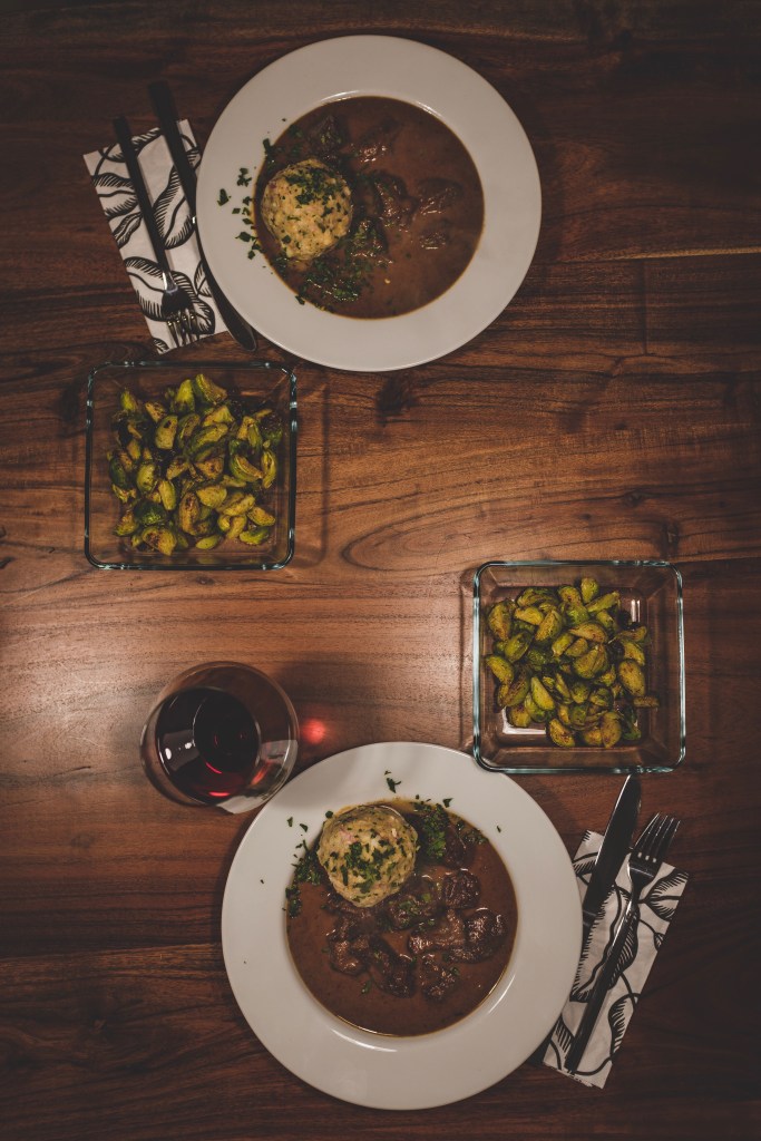 - Damit alle Bausteine des Gerichts gleichzeitig fertigwerden, ist der richtige Zeitpunkt um den Rosenkohl zuzubereiten. Dazu den Strunk entfernen und vierteln. Dabei darauf achten, dass du nicht zu viel wegschneiden, da ansonsten die Blätter auseinander fallen. Das wollen wir nicht.