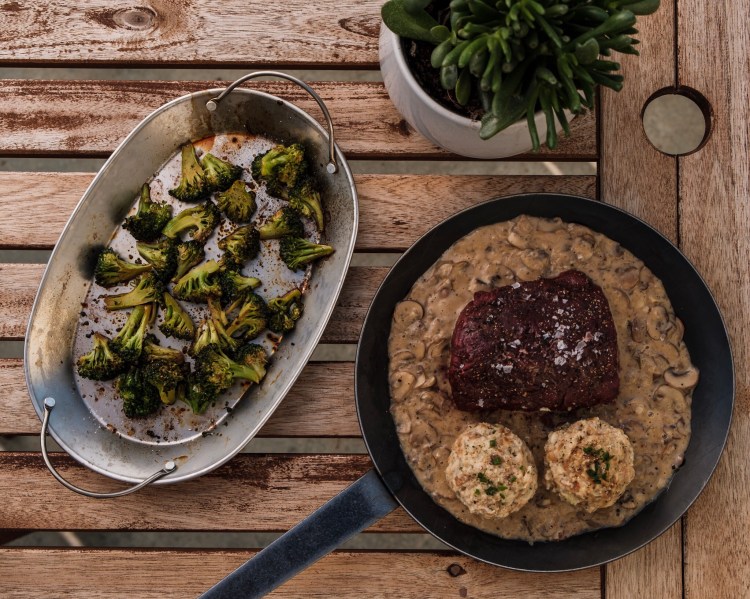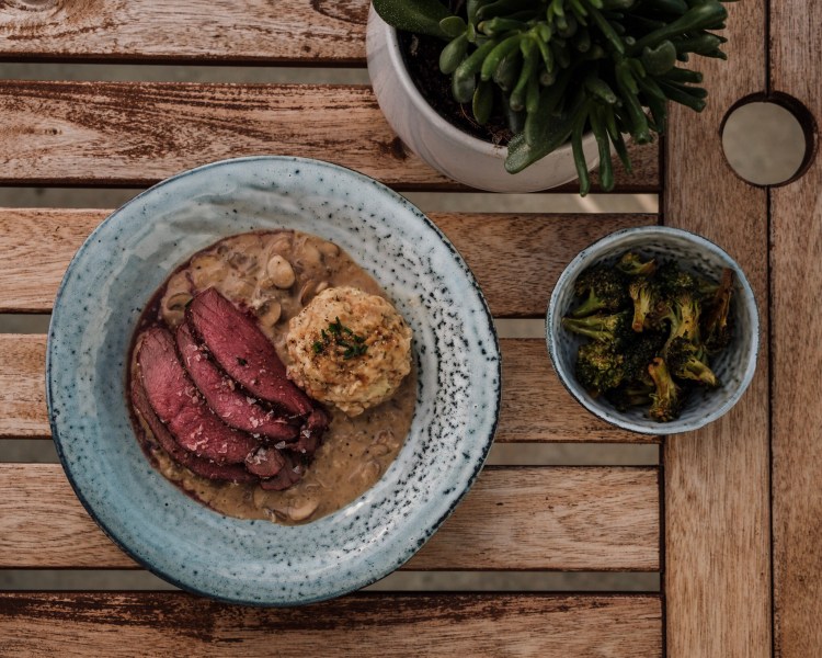 Zu diesem tollen Stück Hirsch gibt es Brezenknödel mit Pilzrahmsoße und einen gerösteten Brokkolisalat.